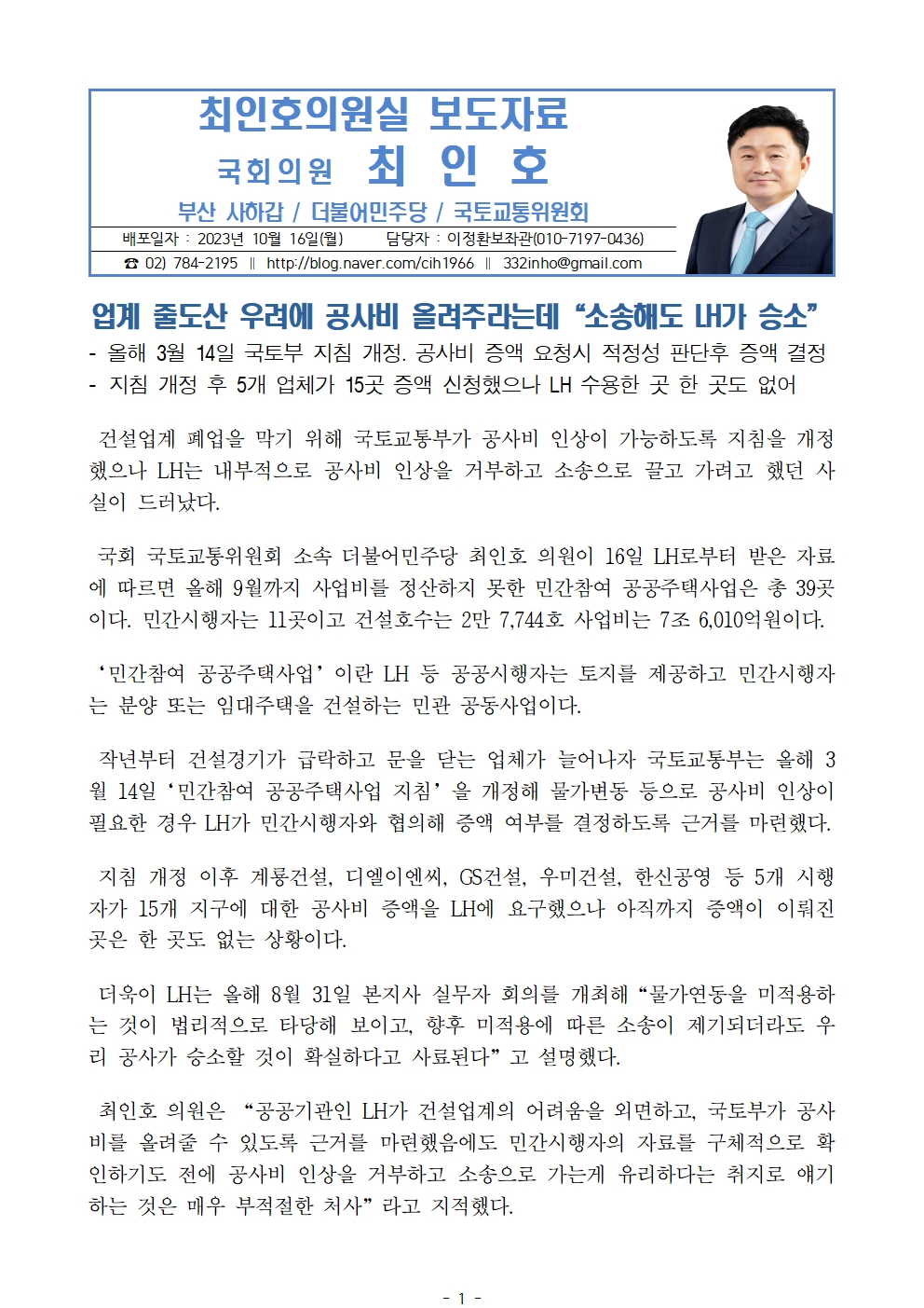 [최인호 의원 보도자료] 업계 줄도산 우려에 공사비 올려주라는데“소송해도 LH가 승소”