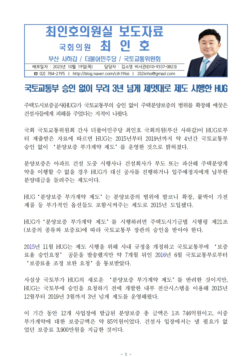 [최인호 의원 보도자료]국토교통부 승인 없이 무려 3년 넘게 제멋대로 제도 시행한 HUG