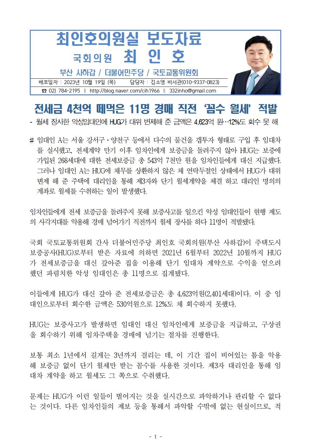 [최인호 의원 보도자료] 전세금 4천억 떼먹은 11명 경매 직전‘꼼수 월세’적발