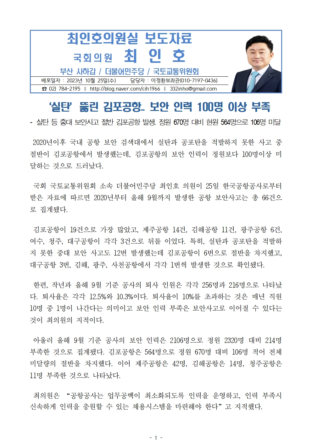 [최인호 의원 보도자료]‘실탄’뚫린 김포공항.. 보안 인력 100명 이상 부족