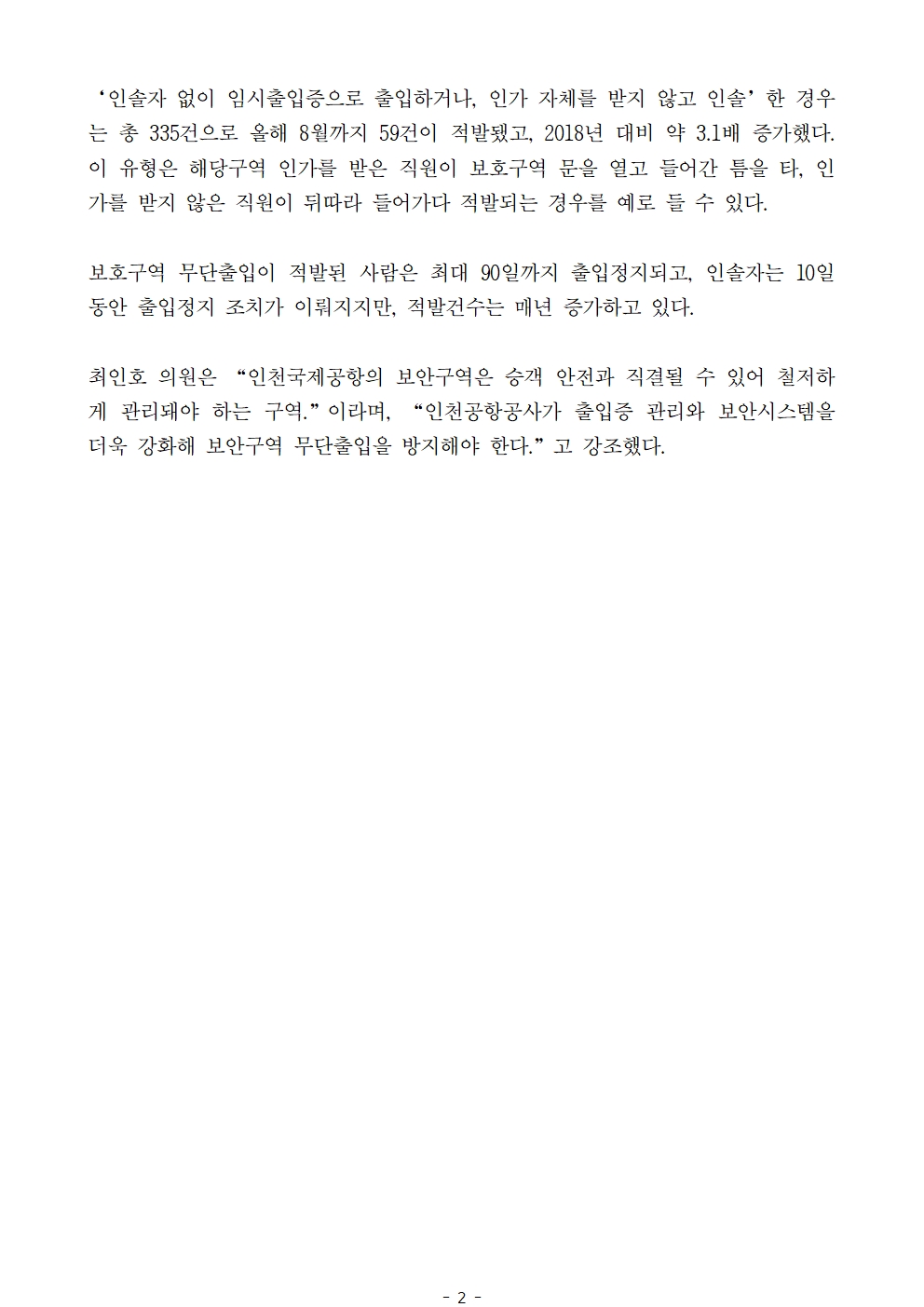[최인호 의원 보도자료] 인천공항, 최근 5년간 보호구역 무단 출입 504건 적발