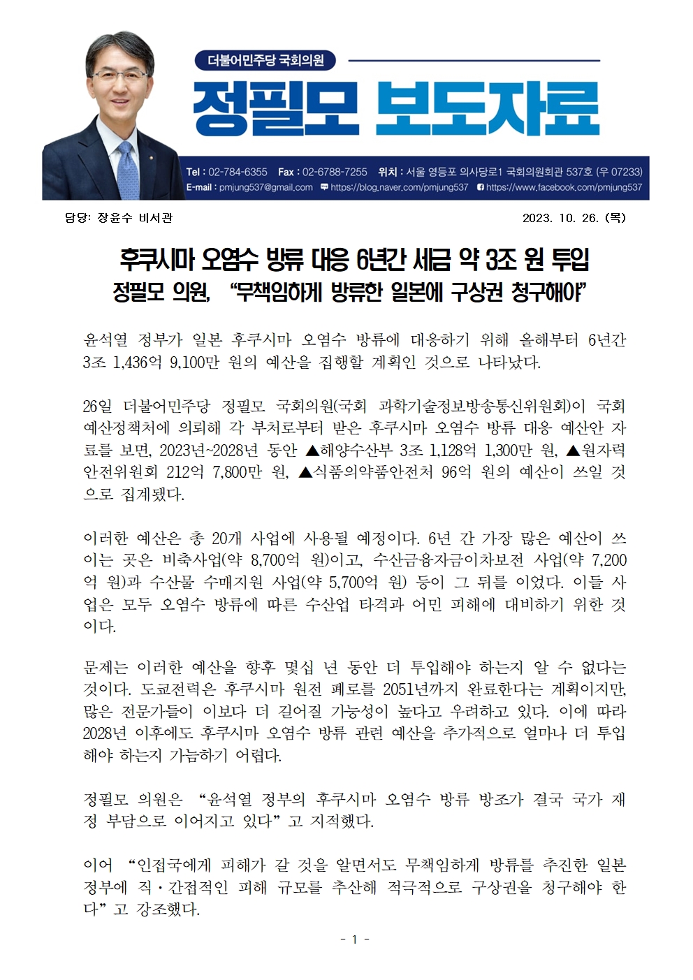 [정필모 의원 보도자료] 후쿠시마 오염수 방류 대응 6년간 세금 약 3조 원 투입