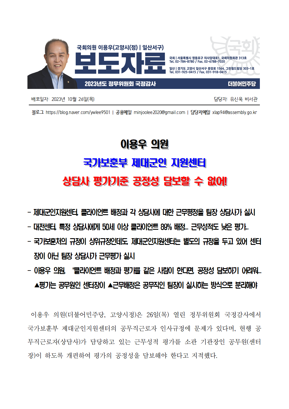 [보도자료] 이용우 의원_ 국가보훈부 제대군인 지원센터 상담사 평가기준 공정성 담보할 수 없어.hwp