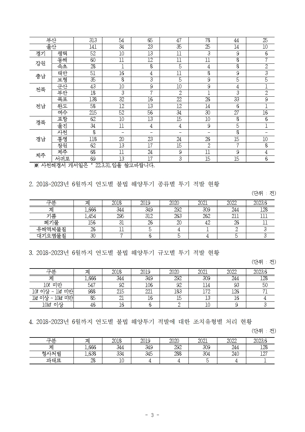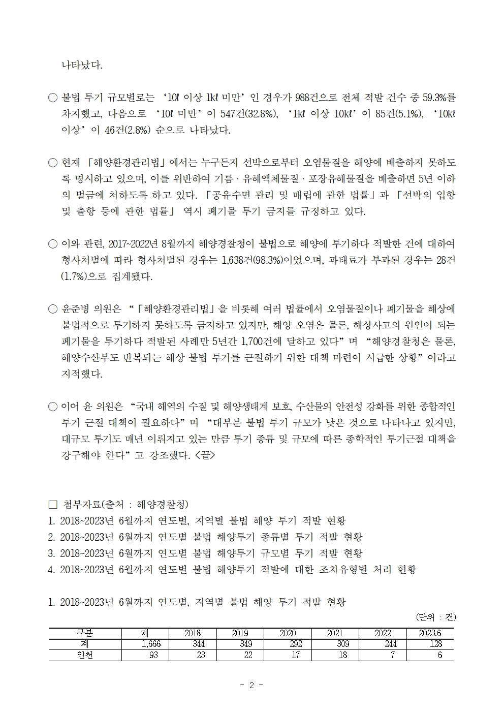 [윤준병 의원 국정감사 보도자료] 윤준병 의원, 오염물질 해양투기 금지에도 5년간 불법투기 1,700건
