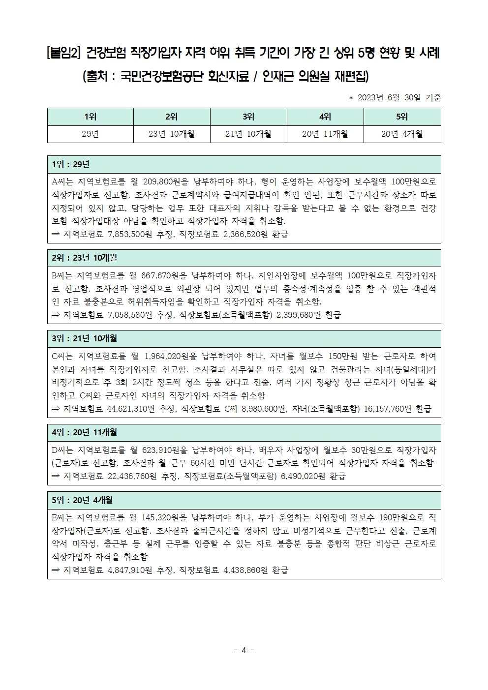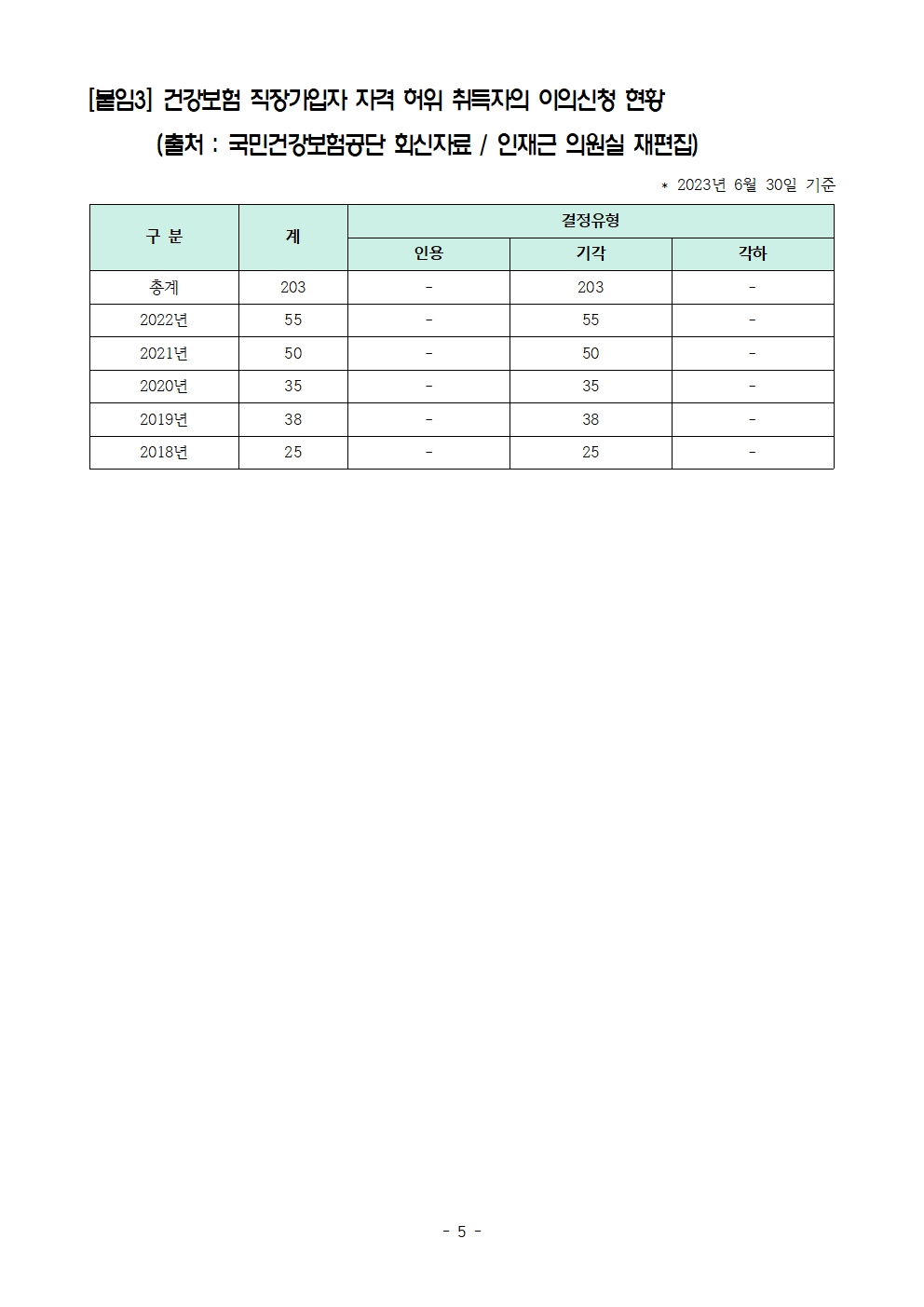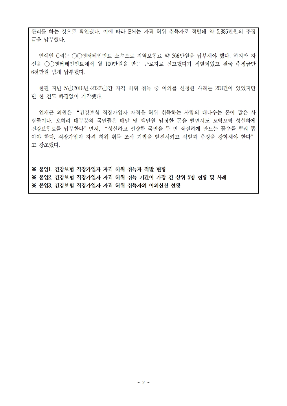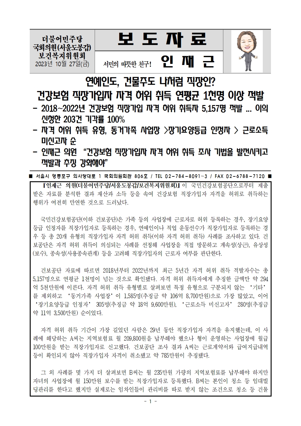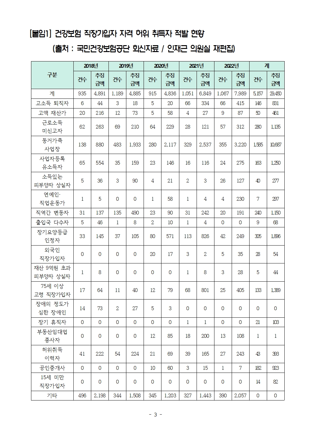 [인재근의원실 보도자료] 연예인도, 건물주도 나처럼 직장인? 건강보험 직장가입자 자격 허위 취득 연평균 1천명 이상 적발
