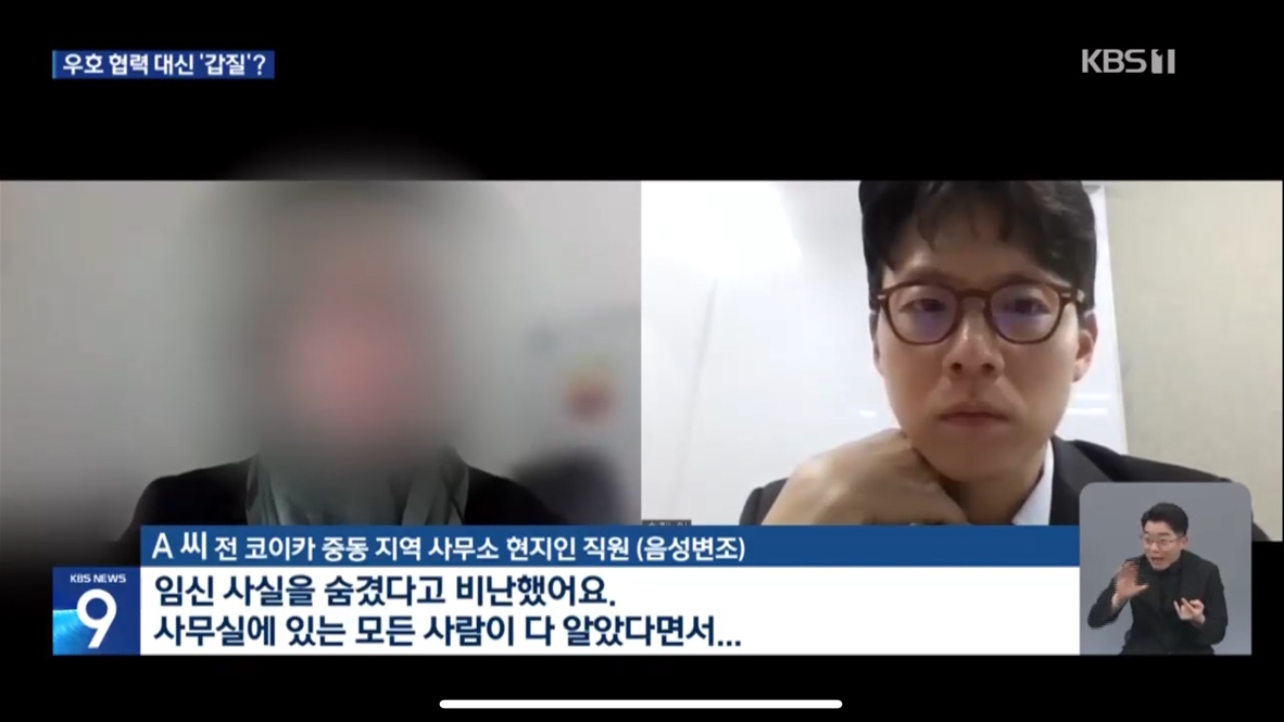 [전 코이카 중동 지역 사무소 현지인 직원/음성변조 : "임신 사실을 숨겼다고 비난했어요. 사무실에 있는 모든 사람이 다 알았다면서..."]