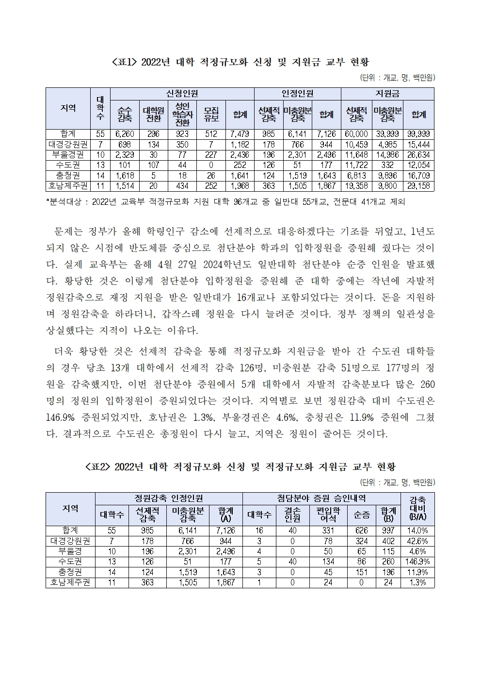[서동용 의원] 22년 자발적 정원감축에 적정규모화 지원금 1,400억원 준 윤석열 정부, 올해는 첨단분야 인력양성 핑계로 수도권 정원 오히려 늘려