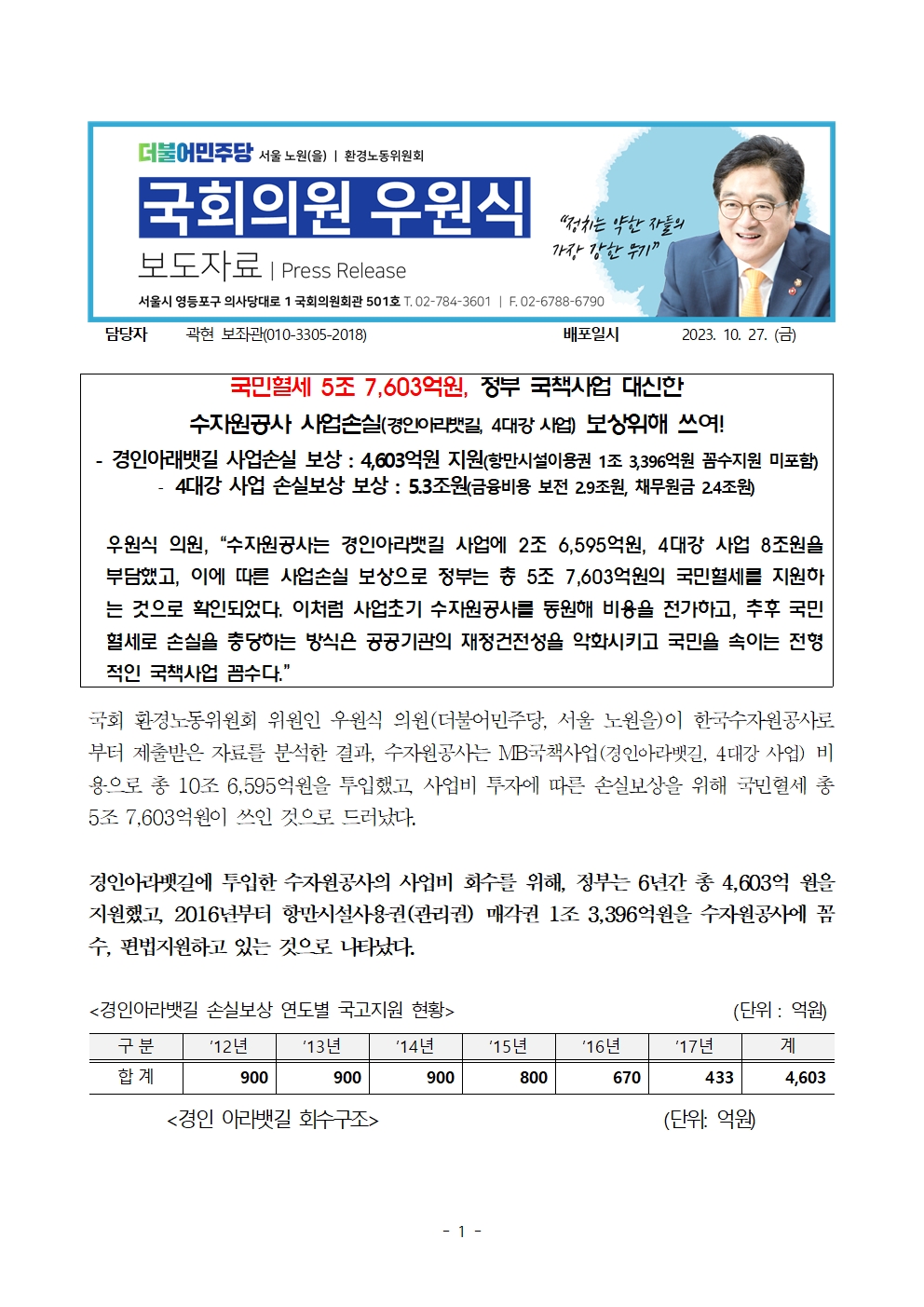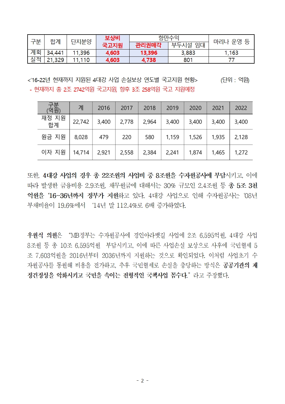 [우원식 의원 보도자료] 국민혈세 5조 7,603억원, 정부 국책사업 대신한 수자원공사 사업손실(경인아라뱃길, 4대강 사업) 보상위해 쓰여!