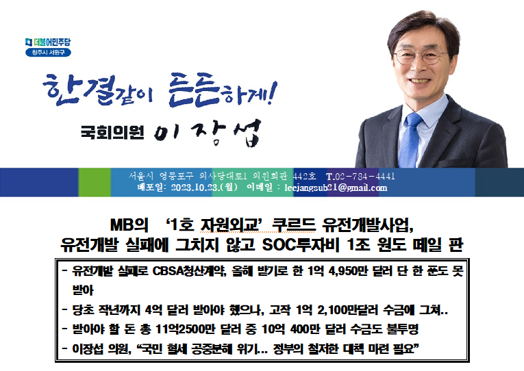 [이장섭의원 보도자료] MB 1호 자원외교 쿠르드 유전개발사업_ 유전개발 실패에 그치지 않고 soc투자비 1조 원도 떼일 판