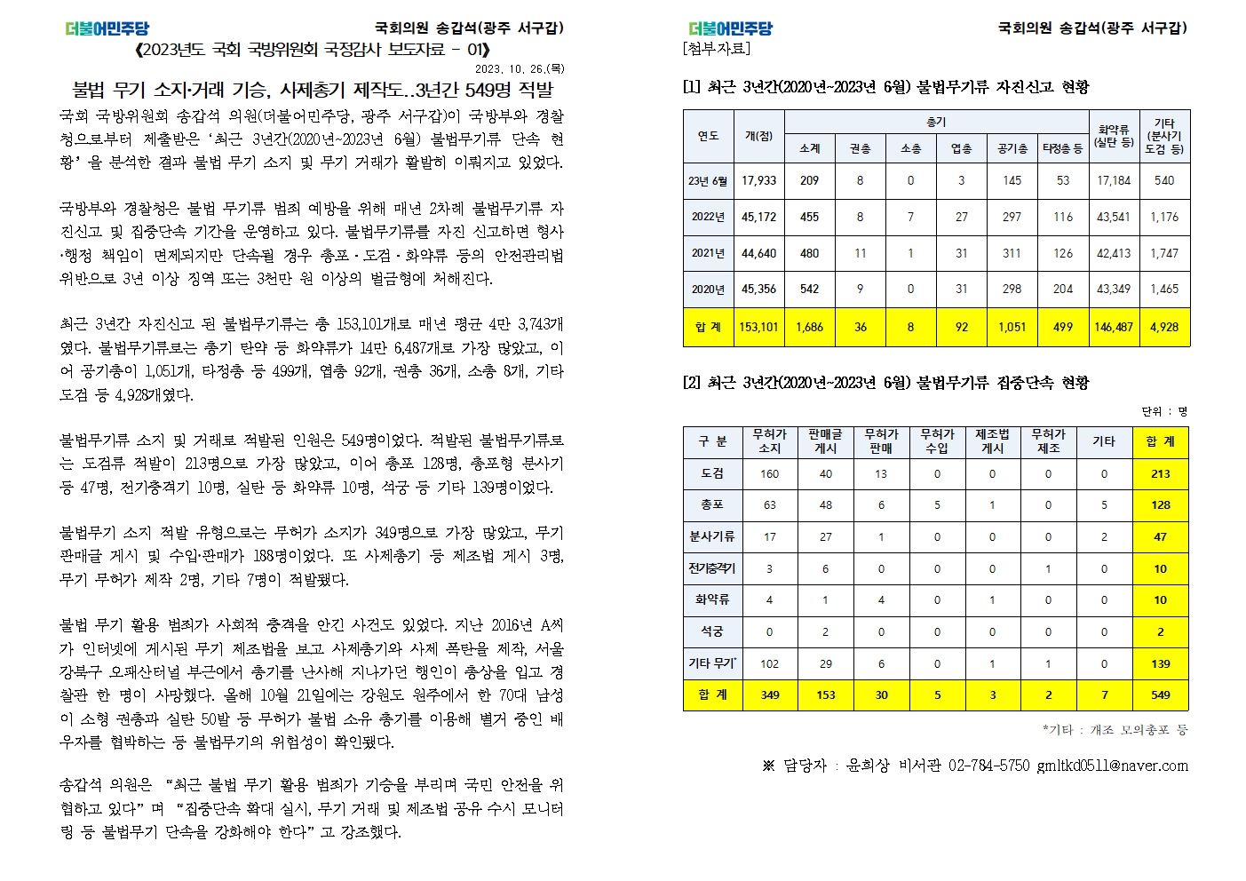 [국회의원 송갑석 국정감사 보도자료] 불법 무기 소지 거래 기승, 사제총기 제작도..3년간 549명 적발