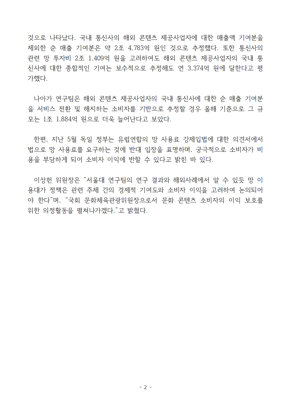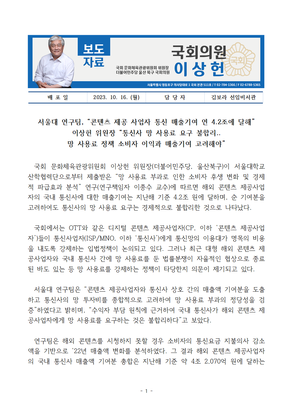 [국회의원 이상헌 보도자료] 서울대 연구팀, “콘텐츠 제공 사업자 통신 매출기여 연 4.2조에 달해” 이상헌 위원장 “통신사 망 사용료 요구 불합리.. "