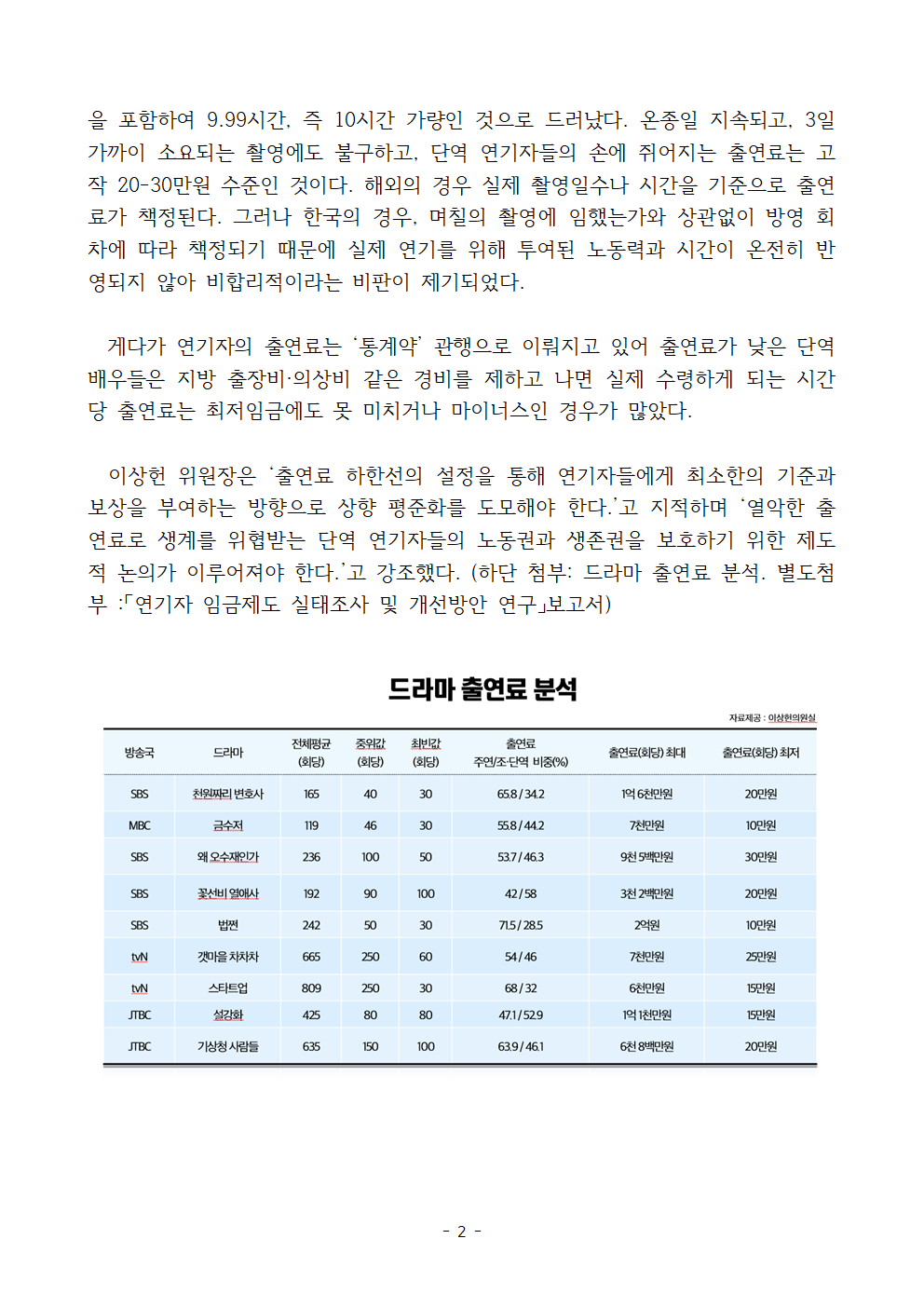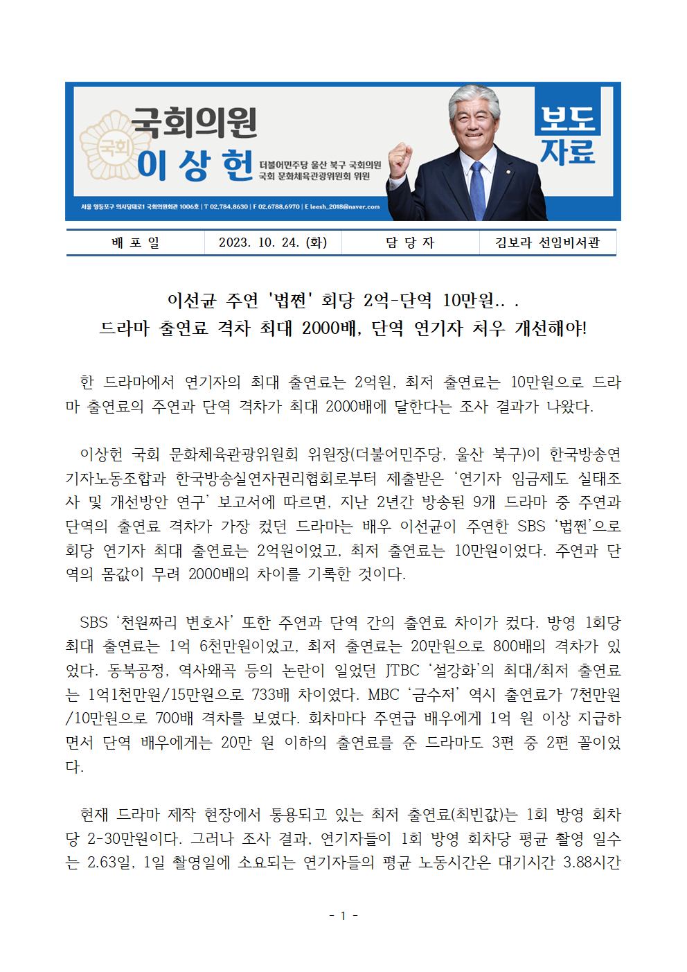 [국회의원 이상헌 보도자료] 이선균 주연 '법쩐' 회당 2억-단역 10만원.. . 드라마 출연료 격차 최대 2000배, 단역 연기자 처우 개선해야!