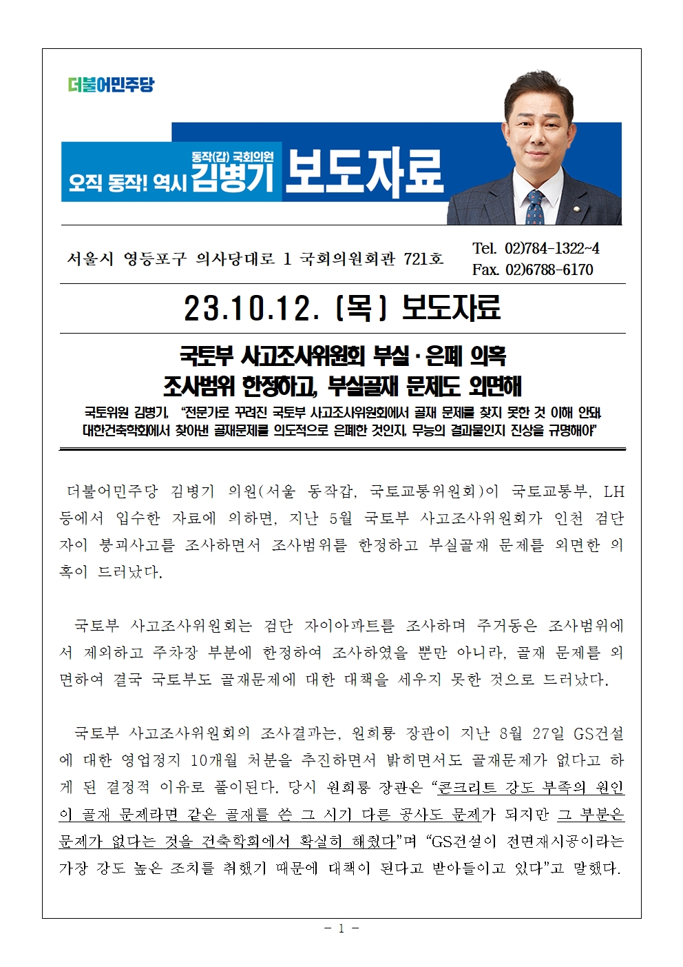 [국회의원 김병기 보도자료] 검단자이 국토부 사고조사위원회, 조사 부실.은폐 의혹