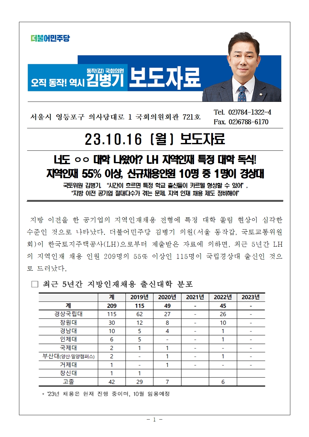 [국회의원 김병기 보도자료] LH 지역인재 특정 대학 독식, 카르텔 형성 우려