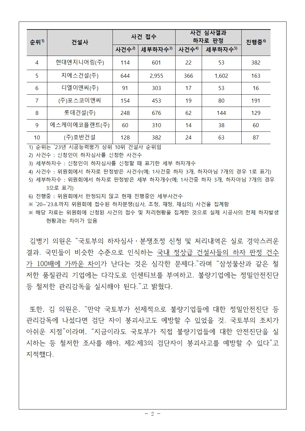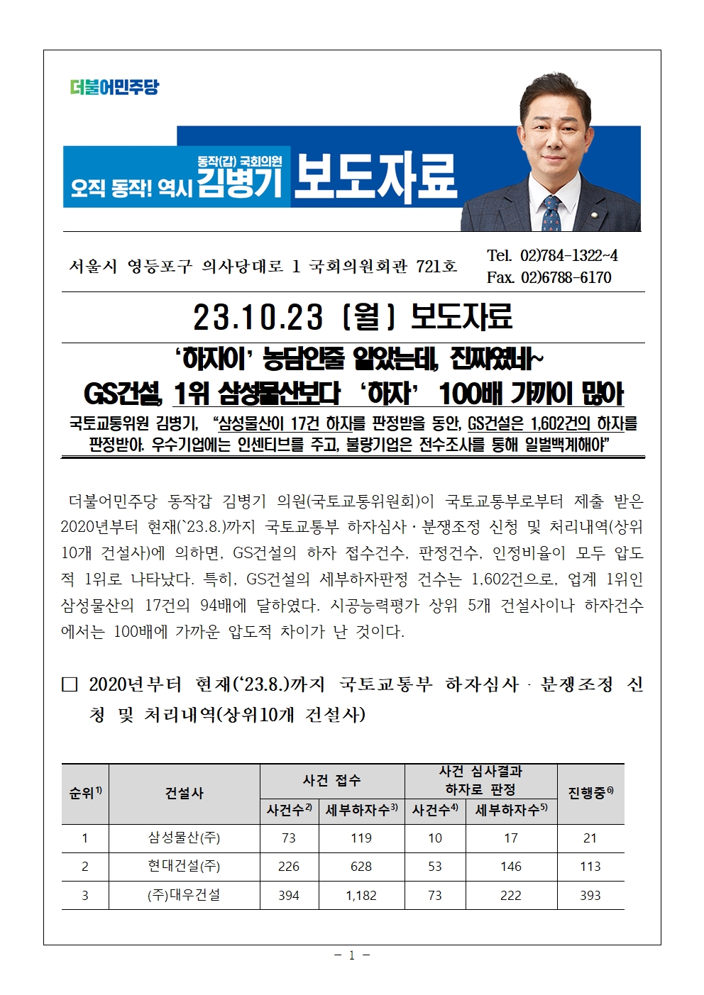 [국회의원 김병기 보도자료] '하자이' 진짜였네. GS건설, 1위 삼성물산보다 '하자' 100배 가까이 많아