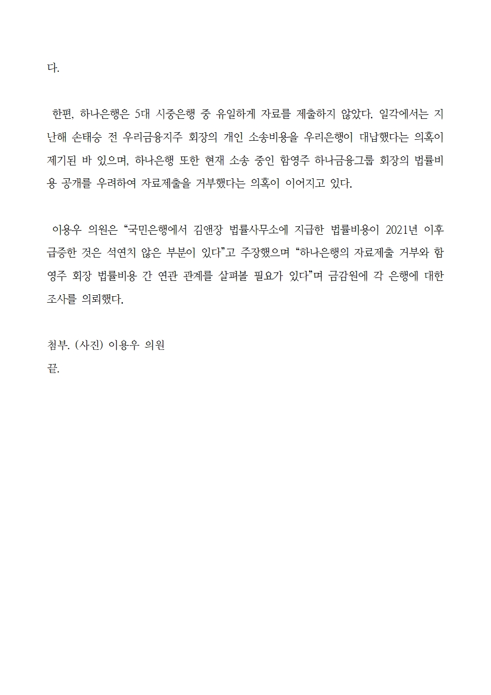 [보도자료] 이용우 의원 KB국민은행 하나은행 법률비용 금감원 조사 필요.hwp