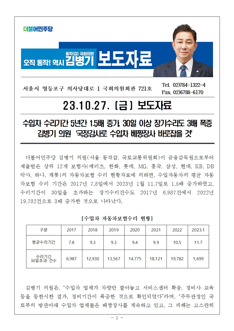 [국회의원 김병기 보도자료] 수입차 수리기간 2배로 늘어, 수입차 배짱장사 바로 잡을 것