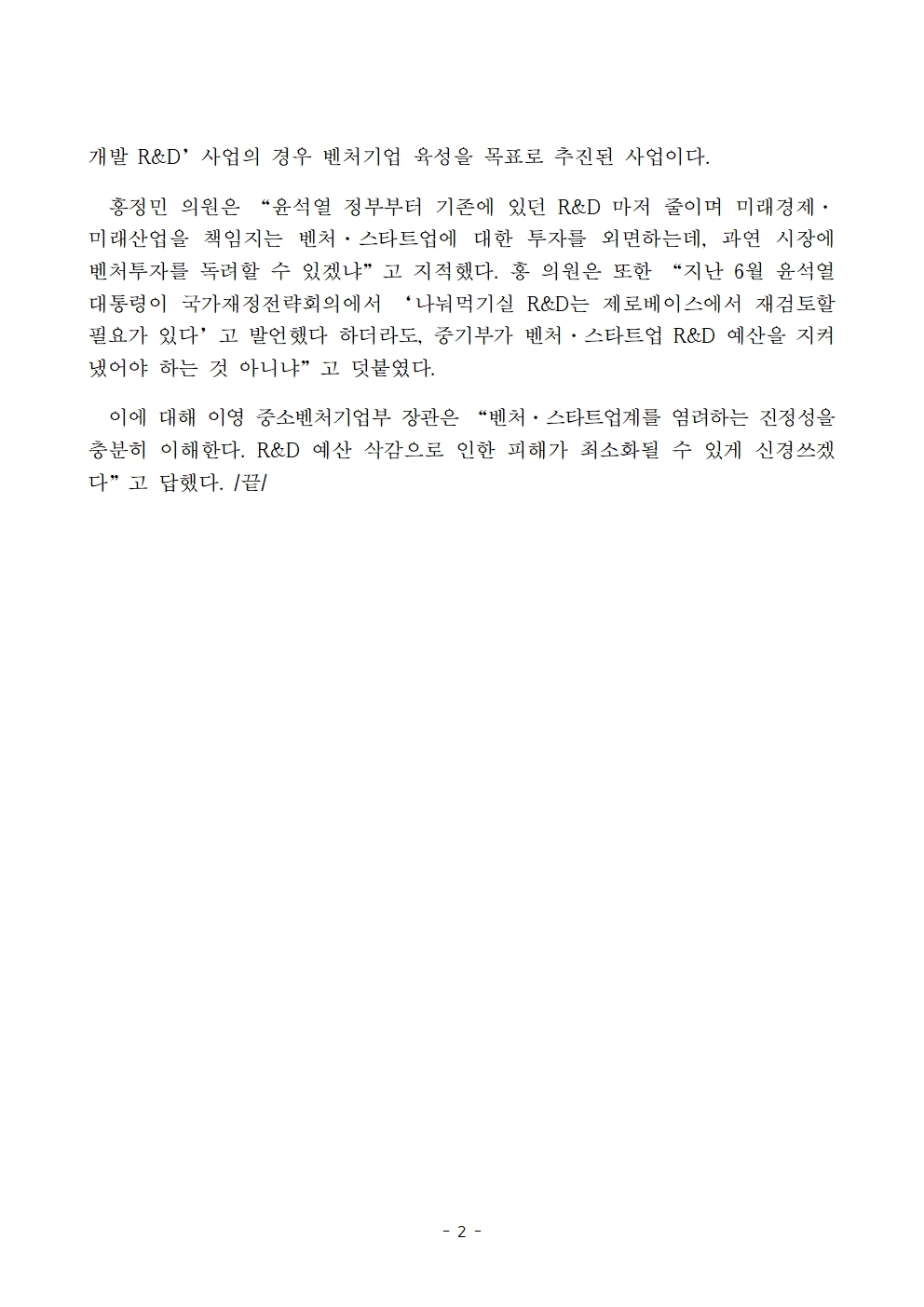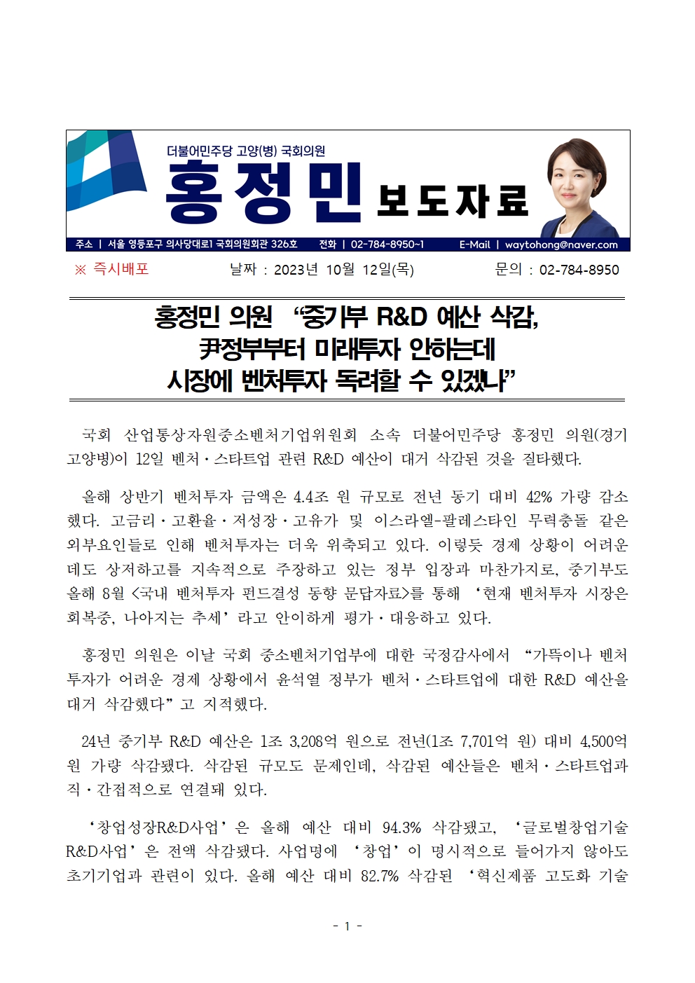 [홍정민 의원 보도자료] 중기부 R&D 예산 삭감, 尹정부부터 미래투자 안하는데 시장에 벤처투자 독려할 수 있겠나
