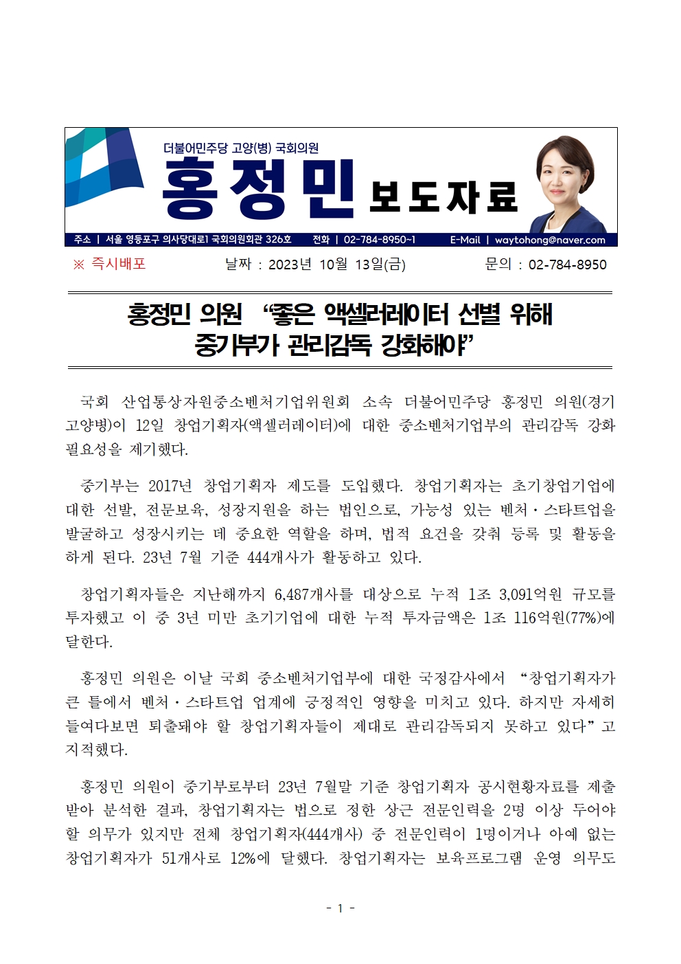 [홍정민 의원 보도자료] 좋은 액셀러레이터 선별 위해 중기부가 관리감독 강화해야