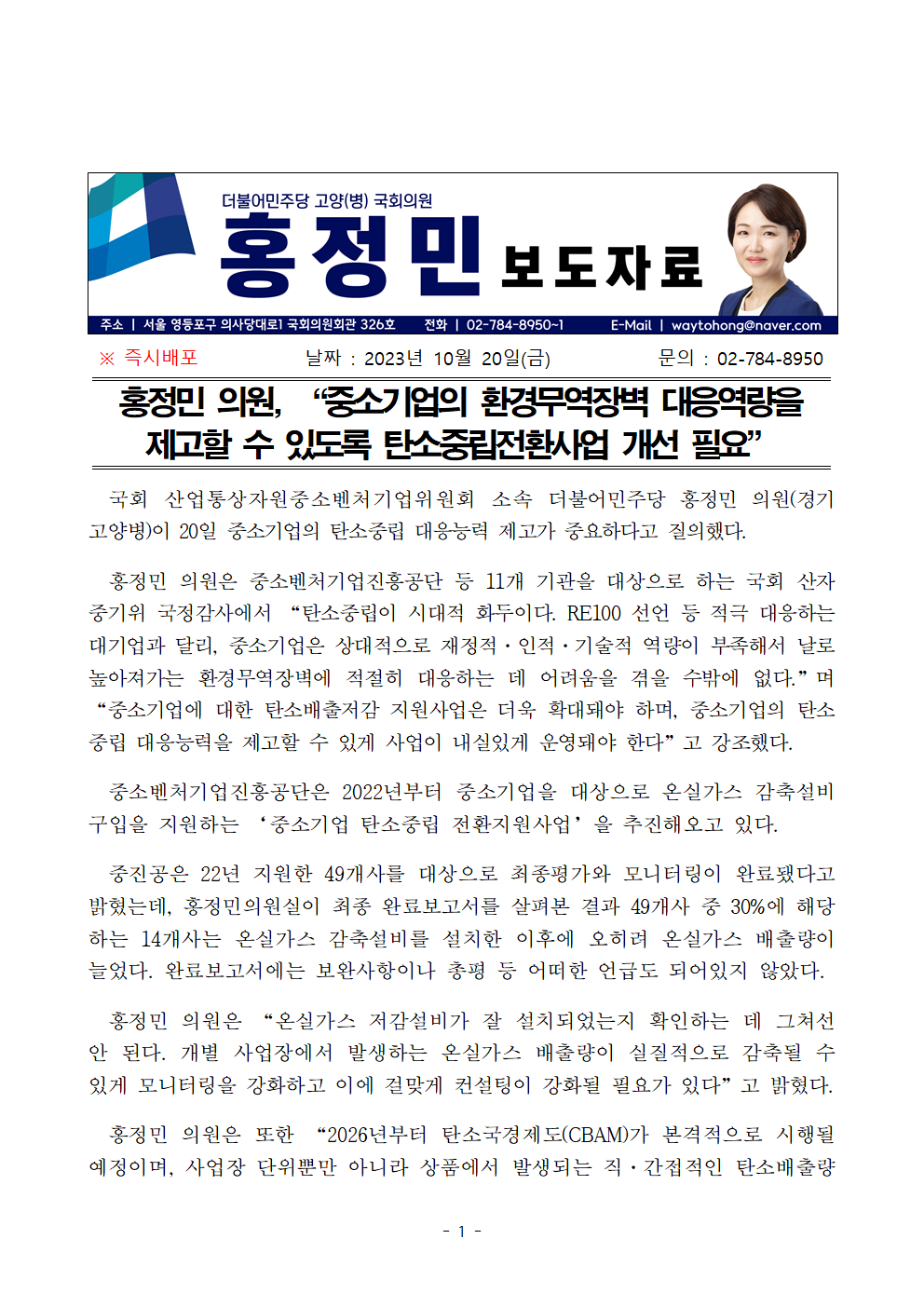 231020_보도자료_홍정민 의원 “중소기업의 환경무역장벽 대응역량을 제고할 수 있도록 탄소중립전환사업 개선 필요”.hwp