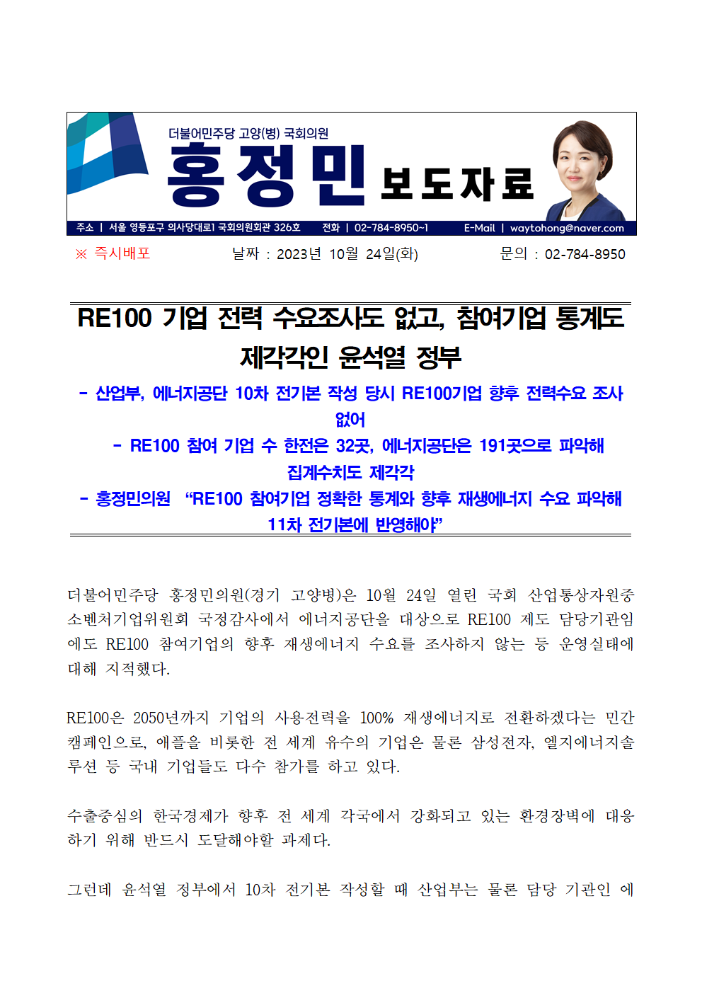 231024_보도자료_홍정민의원_RE100_기업_수요조사도_없고_참여기업_통계도_제각각인_윤석열_정부.hwp