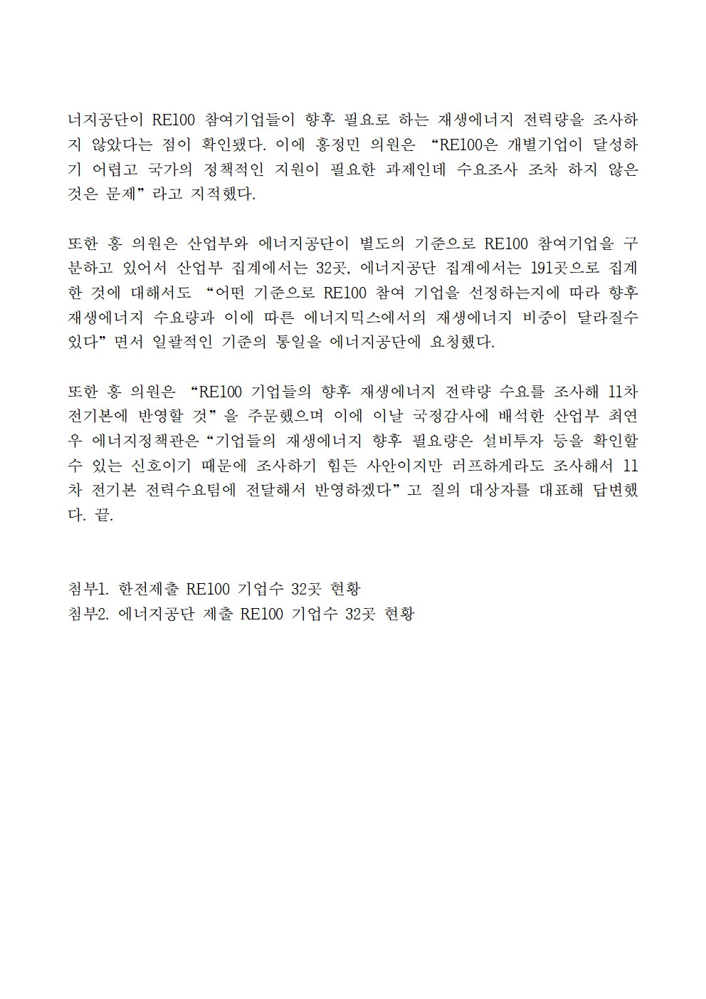 [홍정민 의원 보도자료] RE100 기업 전력 수요조사도 없고, 참여기업 통계도 제각각인 윤석열 정부