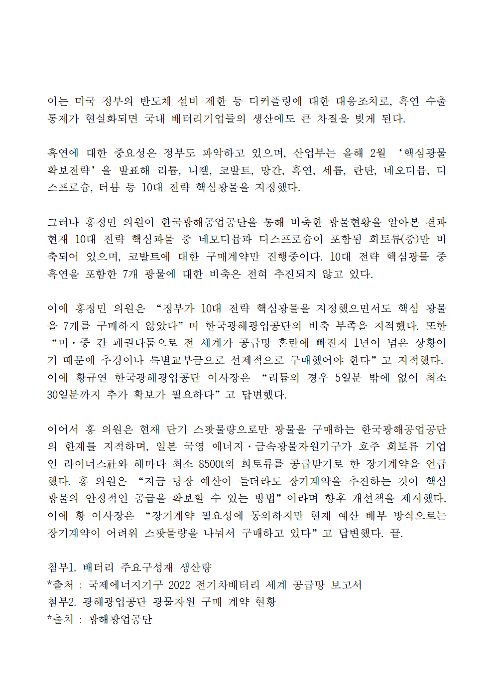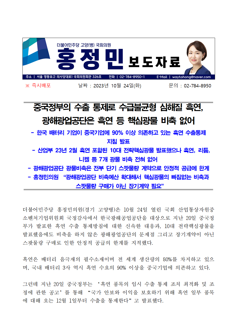 231024_보도자료_홍정민의원_중국정부의_수출_통제로_수급불균형_심해질_흑연_광해광업공단은_흑연_등_핵심광물_비축_없어.hwp