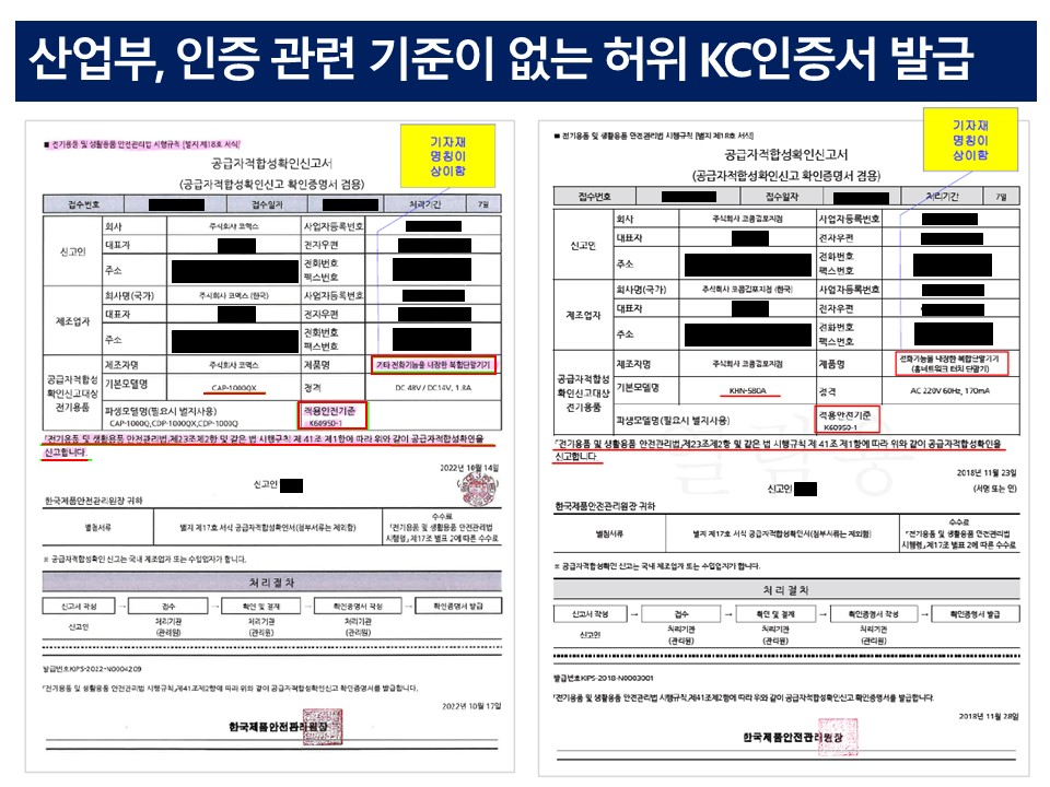 실제 의원실에서 공급자적합성확인신고서(KC인증서)를 입수하여 확인한 결과, 기자재 명칭을 다르게 기입하거나 시험 대상 품목이 아닌 다른 품목으로 허가를 받는 등 허위로 인증을 받은 것으로 밝혀졌다. 세부 품목에 지능형 홈네트워크 기기인 월패드, 홈게이트웨이, 단지서버 등 홈네트워크사용기기가 명시되어야 하지만, 산업부는 홈오토메이션, 비디오도어폰, 기타 전화기능을 내장한 복합단말기기 등으로 인증서를 발급해주고 있는 것으로 드러났다. 또한, 기자재 명칭을 다르게 기재했을 뿐만 아니라, 지능형 홈네트워크 관련 인증을 받았다는 것을 주장하기 위해 인증 품목 목록에도 없는 ‘홈네트워크 터치 단말기’ 명칭을 임의로 삽입했다.