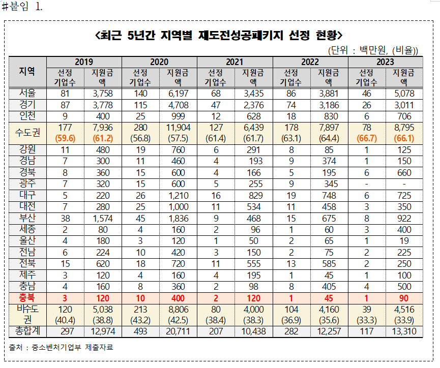 이어 “재도전성공패키지 사업으로 전국에 2022년 282건, 2023년 117건을 지원했는데 충북 지원 건수는 2022년, 2023년 1건씩에 불과했다.”며 “지역별 편중이 심각한 만큼 비수도권 기업에 대한 인센티브 지원등이 필요하다”지적했다.