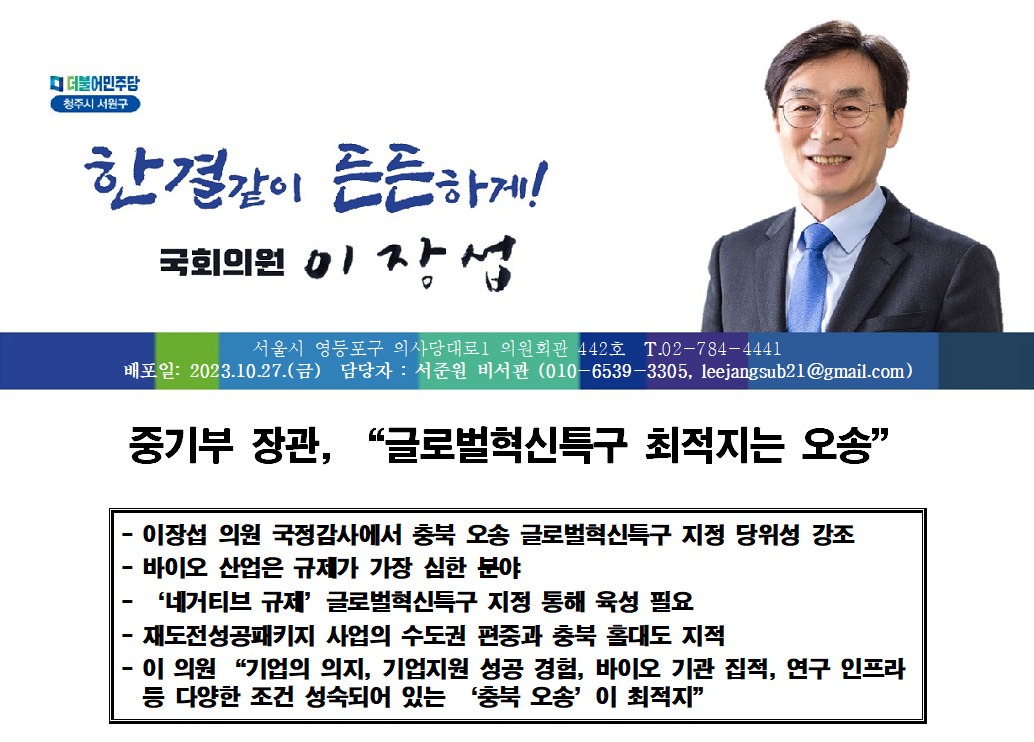 [이장섭의원_231027] 중기부 장관 '글로벌혁신특구 최적지는 오송'