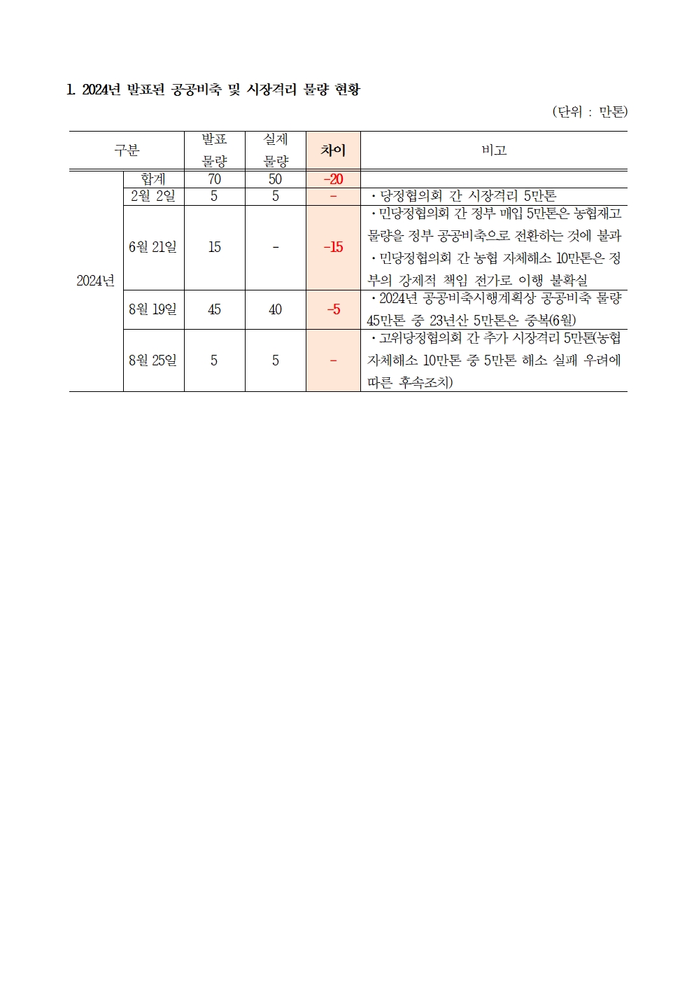 240902 [윤준병 의원 국정감사 보도자료] 윤석열 정권 올해 공공비축·시장격리 발표 물량 중 20만톤 부풀려!.hwp