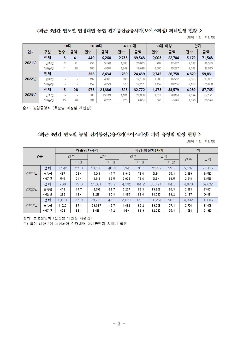 240912 [윤준병 의원 보도자료] “나이 불문” 농협 30대 이하 보이스피싱 피해 1년만에 3배 ‘껑충’.hwp