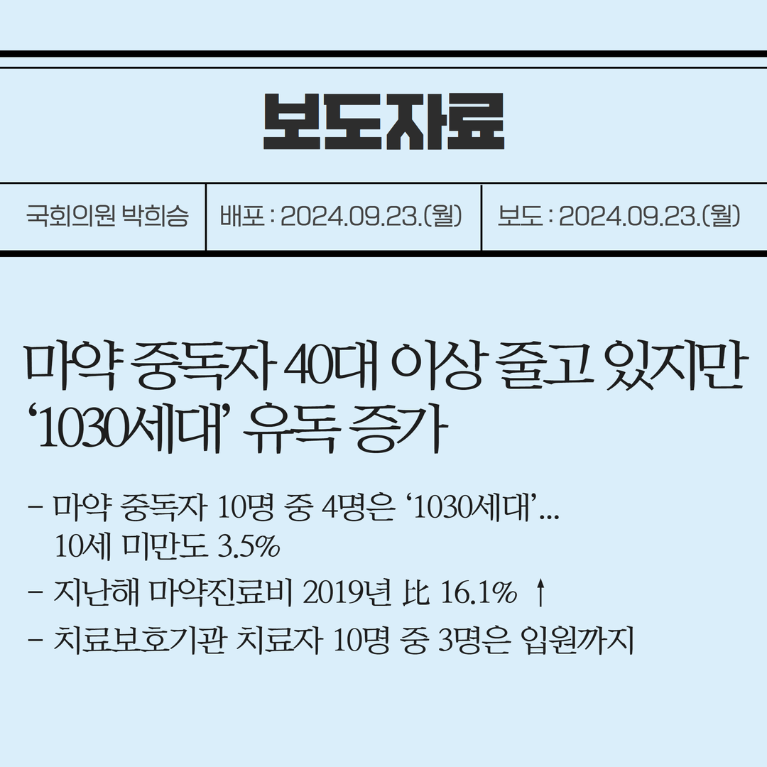 [국회의원 박희승 보도자료] 마약 중독자 40대 이상 줄고 있지만 ‘1030세대’ 유독 증가