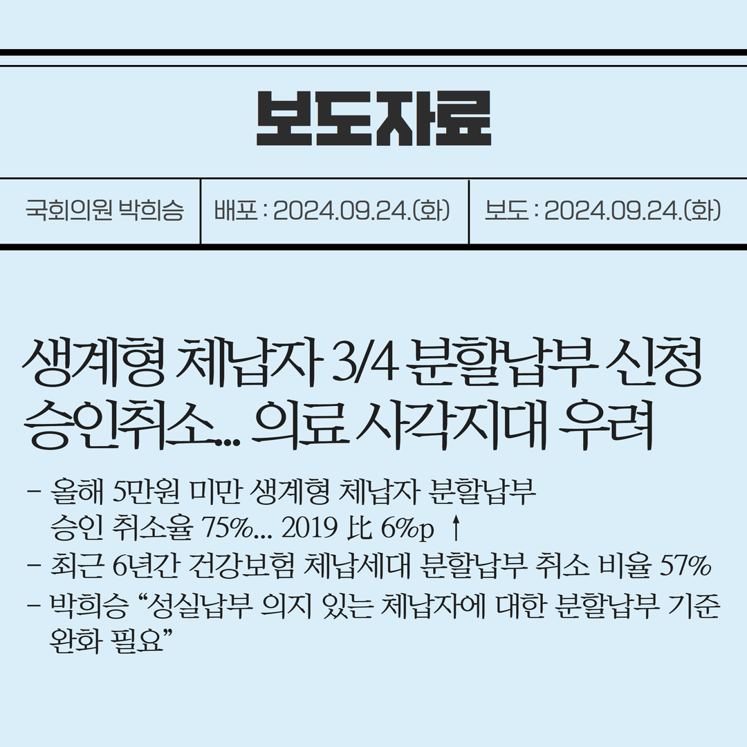 [국회의원 박희승 보도자료] 생계형 체납자 3/4 분할납부 신청 승인취소... 의료 사각지대 우려”