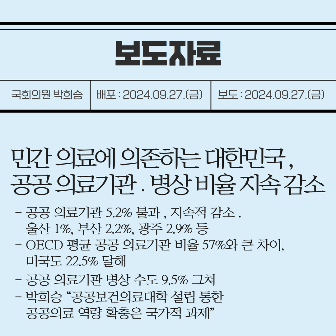 [국회의원 박희승 보도자료] 민간 의료에 의존하는 대한민국, 공공 의료기관․병상 비율 지속 감소