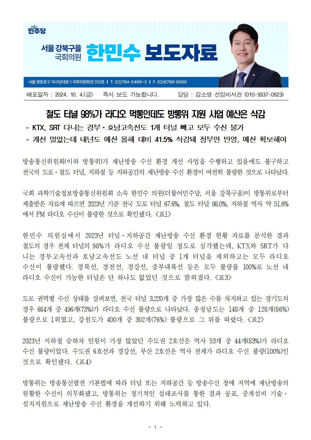 보도자료_한민수의원_철도_터널_98%가_라디오_먹통인데도_방통위_지원_사업_예산은_삭감 (2).hwp