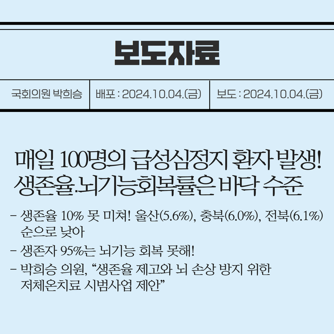 [국회의원 박희승 보도자료] 매일 100명의 급성심정지 환자 발생! 생존율․뇌기능회복률은 바닥 수준