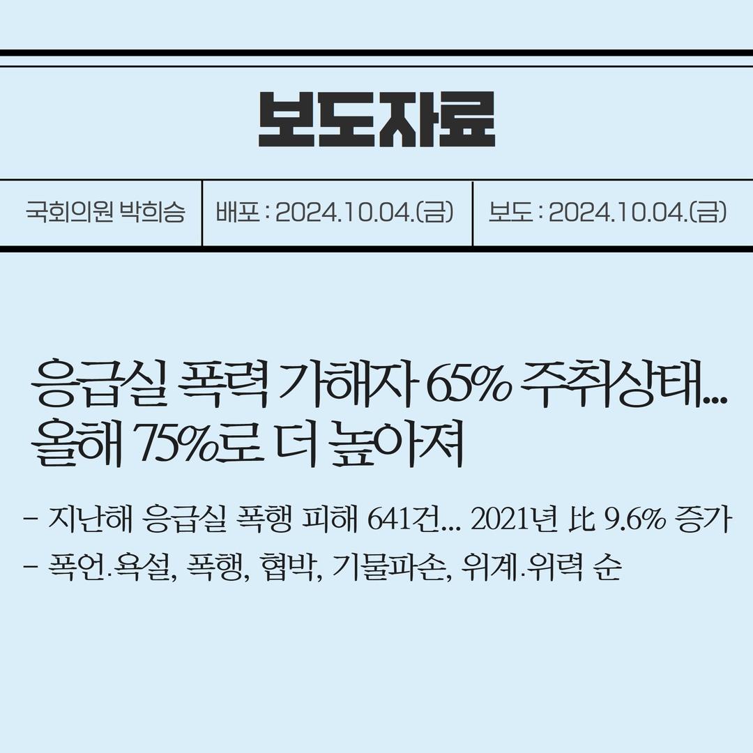 [국회의원 박희승 보도자료] 응급실 폭력 가해자 65% 주취상태... 올해 75%로 더 높아져