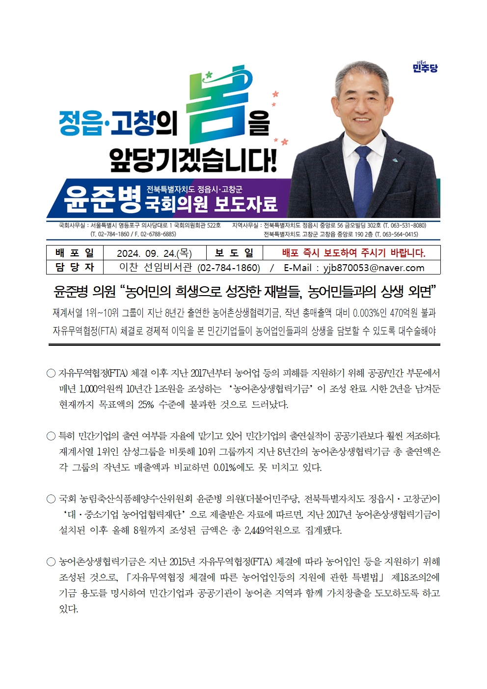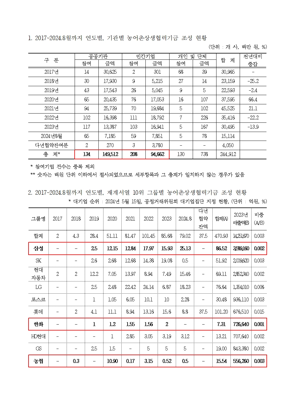 240924 [윤준병 의원 국정감사 보도자료] 재계서열 상위 10위 그룹이 8년간 출연한 농어촌상생기금_ 작년 매출액의 고작 0.003% 불과! (1).hwp