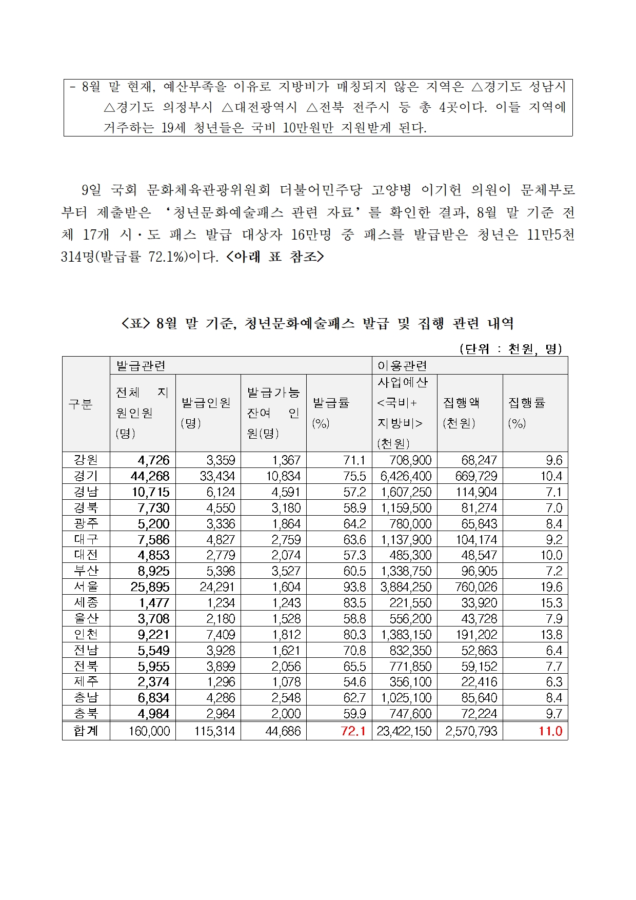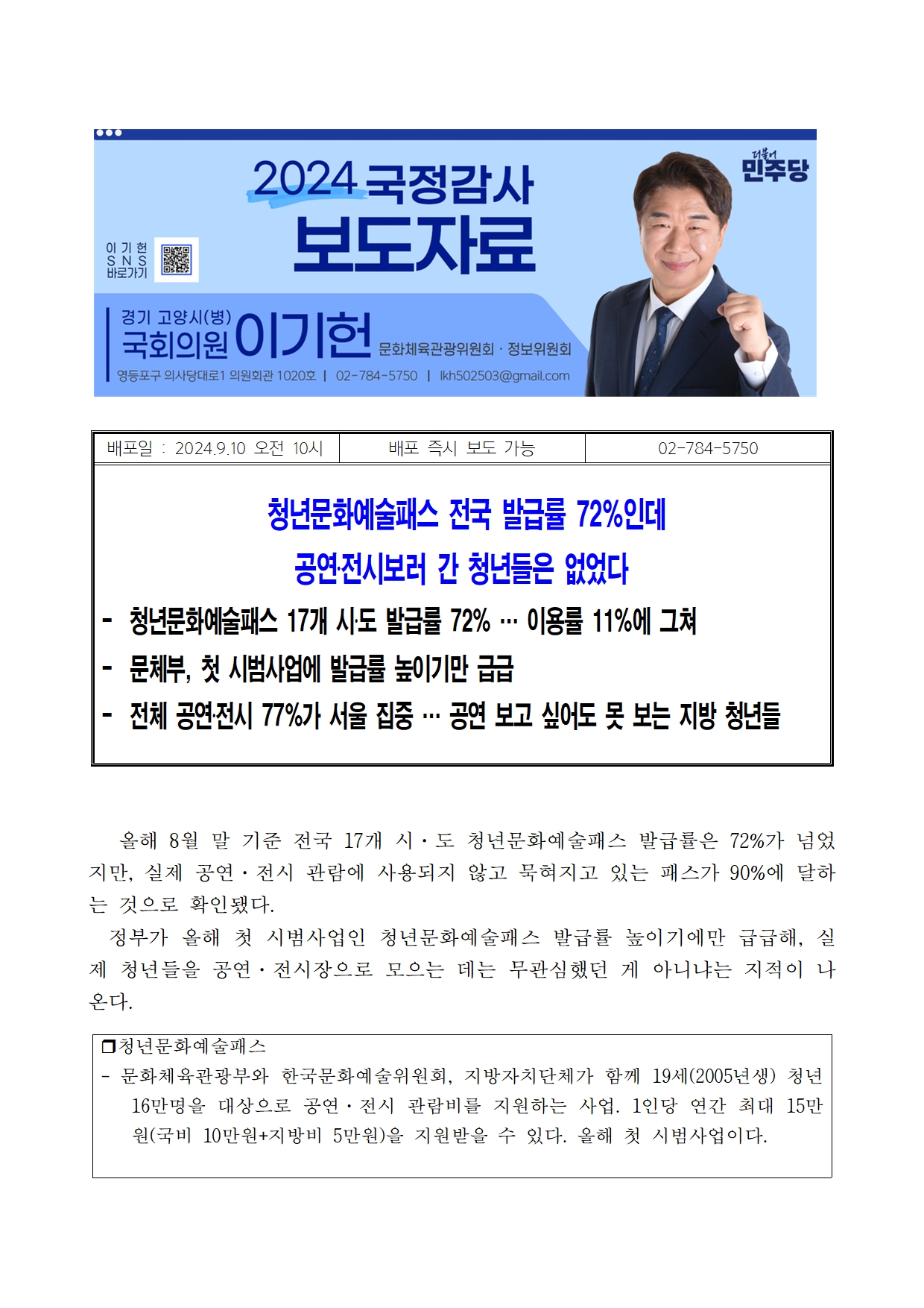 [이기헌 의원(고양시 병) 보도자료] 청년문화예술패스 발급률 72%인데 공연장 간 청년들은 없어