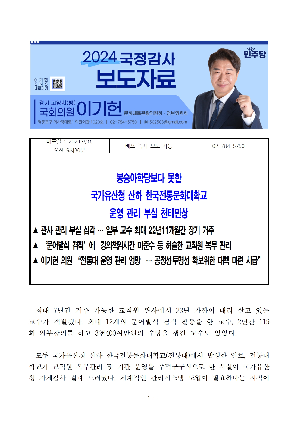 [이기헌 의원(고양시 병) 보도자료]한국전통문화대 운영 관리 부실 천태만상