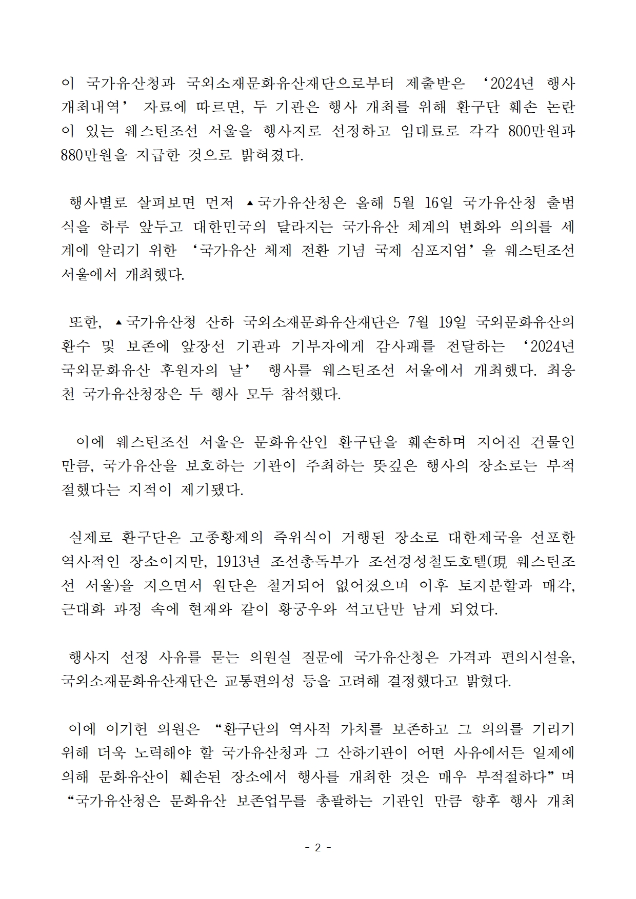 (최종)이기헌_국감보도자료_국가유산 보호에 앞장선다더니 환구단 훼손지에서 행사 개최.hwp