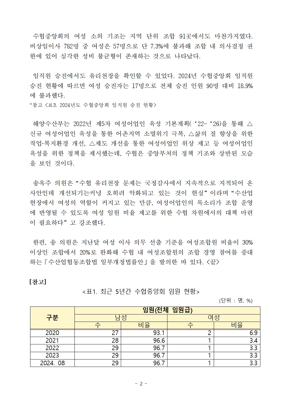 [국회의원 송옥주 국정감사 보도자료] 수협중앙회 임원 30명 중 여성은 단 1명, 자회사 6곳 살펴봐도 여성 임원 1명에 그쳐