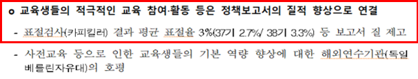 이처럼 이재강 의원실에서 상기 기준으로 확인한 정책보고서의 최고 표절률은 42%에 달했다. 한편 국립 통일교육원의 통일교육 원내과정은 상술한 바와 같이 허술한 관리뿐만 아니라 국민의 혈세가 13.4억 원이나 집행되고 있음에도 정책 실효성을 제대로 담보하지 못하고 있었다.