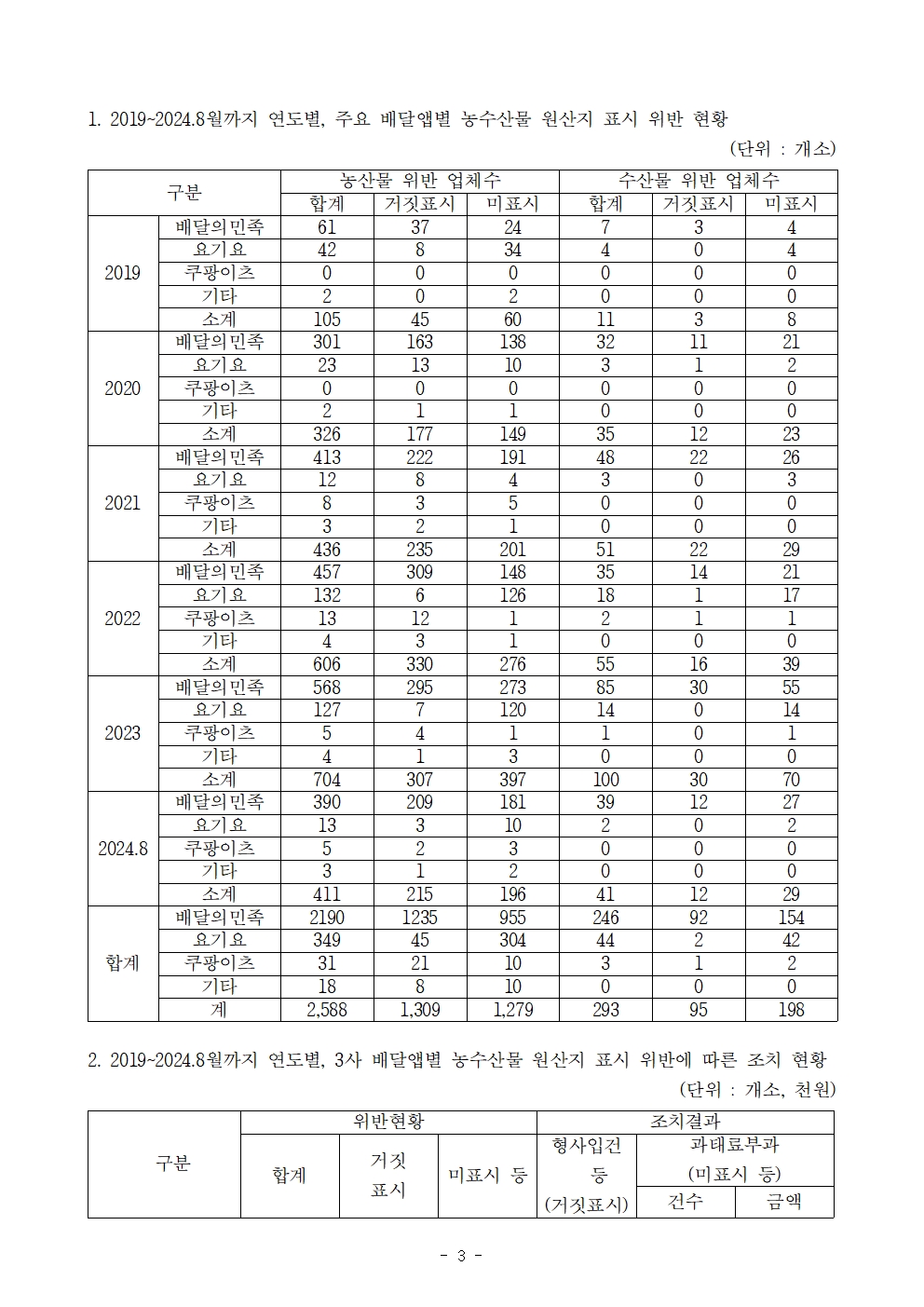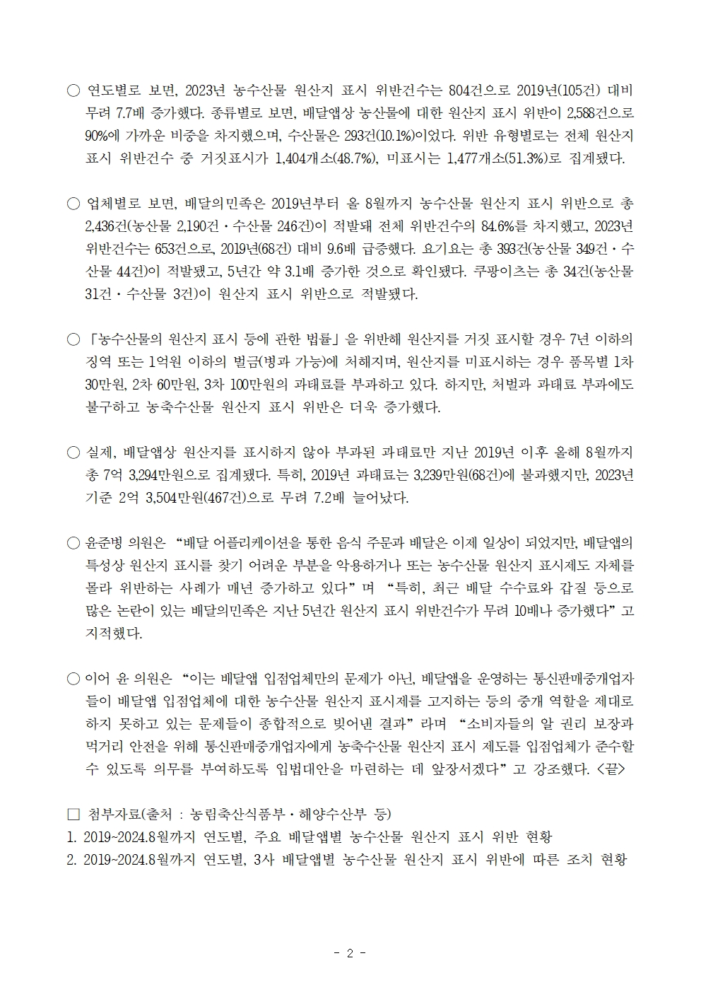 [윤준병 의원 국정감사 보도자료] 윤준병 의원_ 배달앱 배달의민족의 농수산물 원산지 표시 위반 5년 새 10배 급증