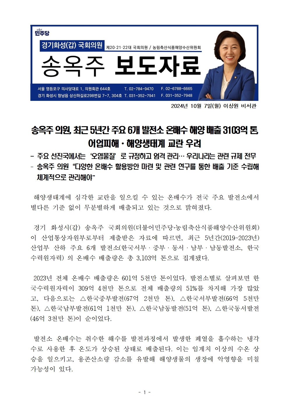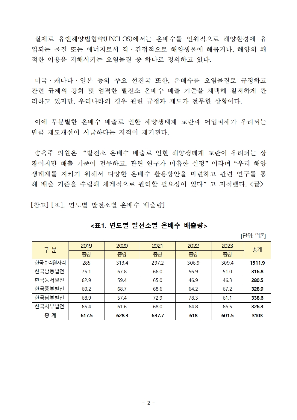 보도자료_송옥주의원실_최근 5년간 온배수 해양 배출 3103억 톤 어업피해ㆍ해양생태계 교란 우려.hwp