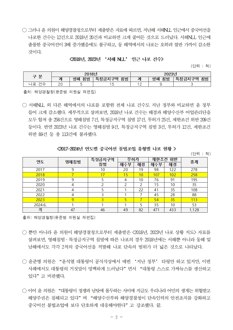 241007 [윤준병 의원 국정감사 보도자료] 윤 정부 들어 서해NLL 부근 중국어선 출몰 3배 늘었지만 나포는 줄었다.hwp