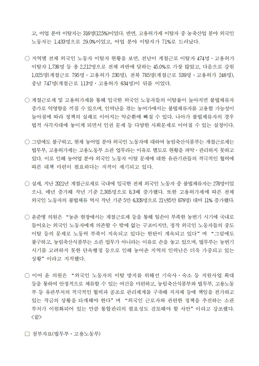 [윤준병 의원 국정감사 보도자료] 최근 3년간 국내 입국한 농어업 분야 외국인 노동자 이탈 7_465명