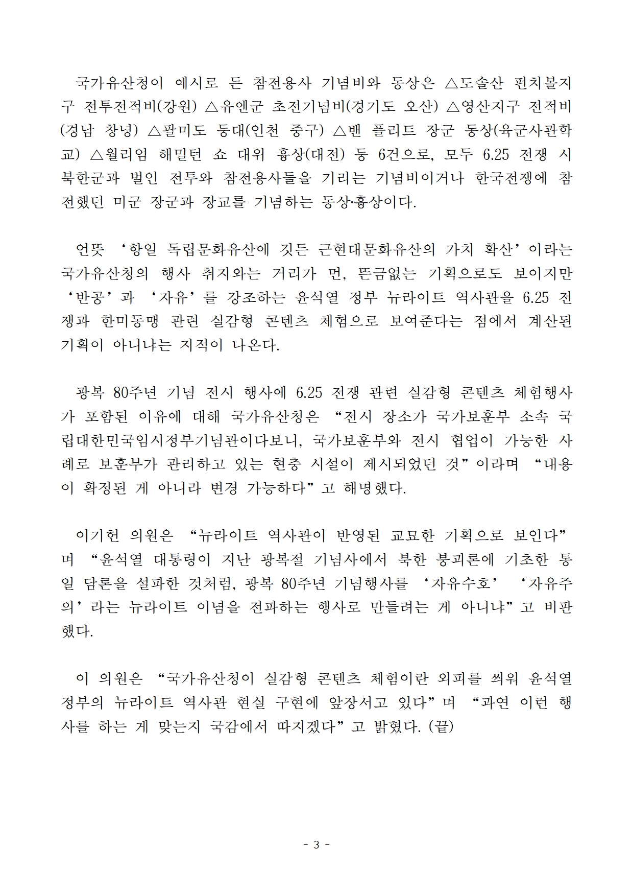 [이기헌 의원(고양시 병) 보도자료]광복 80주년 기념 전시 행사에서 뉴라이트 냄새가…뜬금없이 6.25전쟁 실감형 콘텐츠 체험행사 끼워 넣은국가유산청