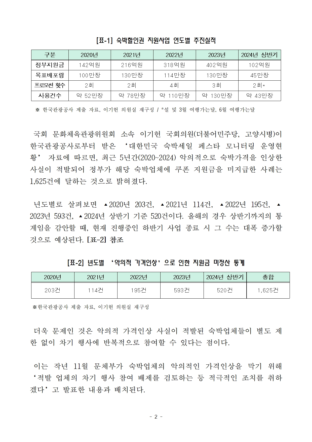 [이기헌 의원(고양시 병) 보도자료]숙박업소들, 숙박할인권 발행 계기 악의적 가격 인상 사례 급증